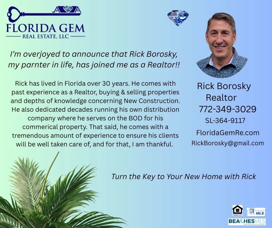 Please contact Rick at 772-999-8633 or RickBorosky@gmail.com for all of your Real Estate needs.
