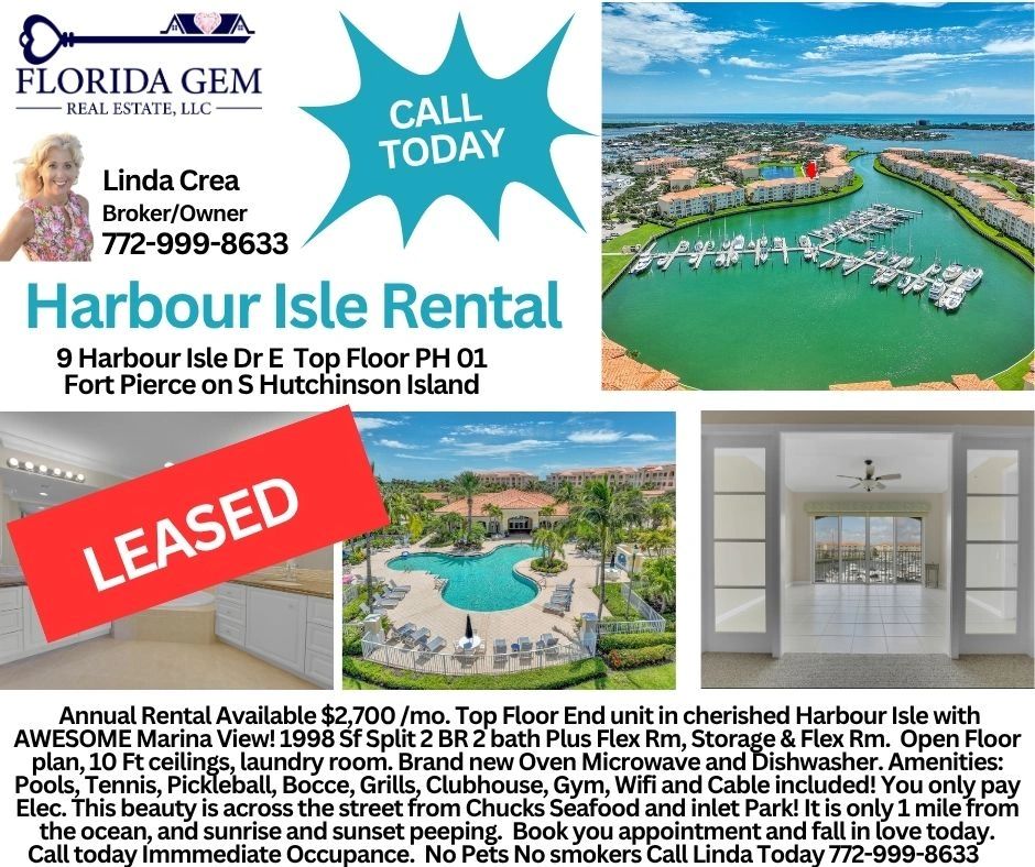 Beautiful annual rental in the West side of Harbour Isle on S. Hutchinson Island. 1989 SF featuring 10 foot ceilings and breathtaking views. 3 BR 2 Bath with bonus 8 x 8 flex room, storage and more! If you would like me to find you a home too, please call 772-999-8633 or click the link below.